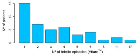 Histogram that illustrates the distribution of patients experiencing a varying number of febrile episodes according to Viture®. In total, 154 febrile episodes were detected with continuous temperature measurements, corresponding to 44 patients.
