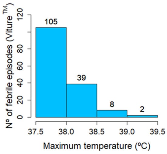 With Viture®, a total of 154 febrile episodes were detected, corresponding to 44 patients (24.4%). Of these, 45.5% had COVID-19 and 64.5% had other infectious diseases. Figure 6, Figure 7 and Figure 8 show the number of febrile episodes detected per patient, the maximum temperature detected, and the time duration in hours per febrile episode, respectively. Most febrile episodes had axillary temperatures below 38 °C and lasted up to 9 h.