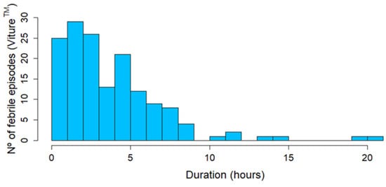 Time duration in hours per febrile episode. Most febrile episodes detected lasted up to 9 h.