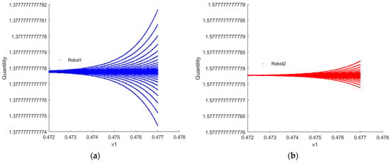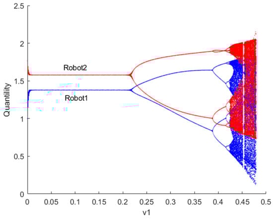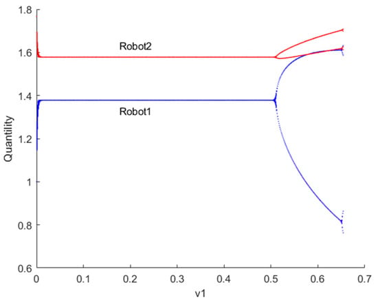 Figure 6 illustrates the bifurcation diagram of resource provision for robots 1 and 2 as the decision parameter changes when . If , robots engage in Stackelberg games. It can be observed that the output of robots 1 and 2 fluctuates near the predicted equilibrium point. If the current profit of robots is positive, increasing the output adjustment speed in the next period can gain more advantage. When the adjustment speed exceeds = 0.505, the system transitions from a Stackelberg game-predicted equilibrium to a chaotic state.