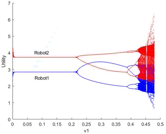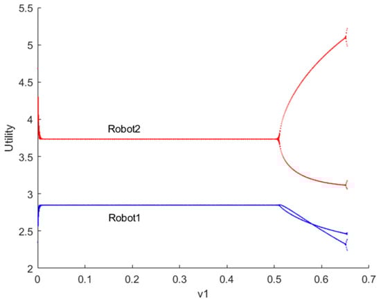 Bifurcation diagram of utility for robots 1 and 2 when .