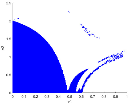 Figure 2 illustrates the stability region plot of and at the Nash equilibrium when . It can be observed that when the decision parameters ( and ) of robots 1 and 2 vary within the shaded region, the Nash equilibrium is stable. Notably, and decrease independently as the other increases, indicating that both robots are inclined towards adopting competitive strategies. In addition, the figure illustrates the symmetry of the stabilization regions for and under the Nash equilibrium. This symmetry suggests that the chaotic behavior exhibited by the system remains consistent when and are varied within a specified range. Consequently, the subsequent discussion will concentrate on the decision parameter and investigate its impact on the system’s stability and chaotic behavior.
