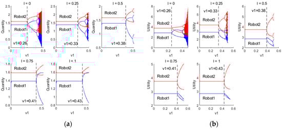 (a) Bifurcation diagram of the quantity of resources to provide for robots 1 and 2 under different ; (b) Bifurcation diagram of the utility for robots 1 and 2 under different .