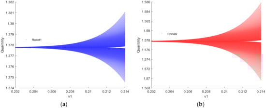 Figure 7 illustrates the bifurcation diagram of utility for robots 1 and 2 as the decision parameter changes when . From the graph, it is evident that the equilibrium utility curves for both robots are horizontal lines, indicating that the equilibrium utility does not vary with the adjustment speed of the output. Since robot 2 acts as the output leader in the Stackelberg model, it possesses slightly higher equilibrium utility compared to robot 1. In pursuit of greater profits, robot 2 continuously increases the output adjustment speed , which consequently impacts the utility of robot 1. As a result, the equilibrium utility becomes unstable, and the system enters a state of bifurcation and chaos.