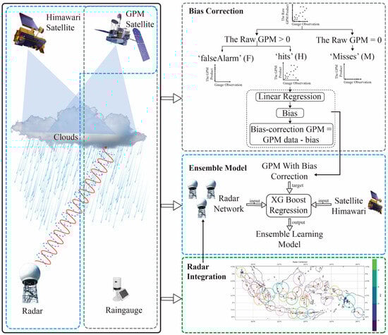 The data sources used in this research consisted of satellite data, weather radars, and rain gauges provided by the BMKG. The weather radar and rain gauge data were obtained directly from the BMKG monitoring system, which operates in various regions of Indonesia. A complex method for rainfall estimation is proposed in this study. This study included a bias correction process for satellite data to ensure data accuracy and weather radar data integration and implemented the XGBoost machine learning ensemble to process big data. The research stage diagram can be seen in Figure 1.