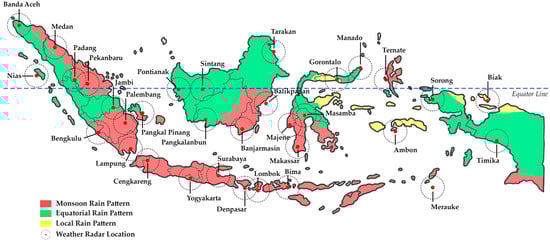 Indonesia is an archipelagic country situated in Southeast Asia, straddling the equator. Indonesia is located between 6° N to 11° S and 95° E to 141° E. Geographically, Indonesia consists of more than 17,000 large and small islands, making it the largest archipelagic country in the world. Overall, the land area is 1,993,662,036 km2; meanwhile, the water area reaches 6,653,341,439 km2 []. These geographic characteristics provide Indonesia with a diverse landscape, including mountains, tropical rainforests, and long beaches. More than 54,700 km of coastline connects the land with the sea, one of the main factors that influences the rainfall patterns in various regions of Indonesia. In this study, understanding the geography of Indonesia is fundamental to the process of rainfall estimation. Climatologically, Indonesia’s territory consists of seasonal zones and non-seasonal zones []. Indonesia’s territory is also divided into three types of rain patterns, namely, monsoonal, local, and equatorial types [], as shown in Figure 2.
