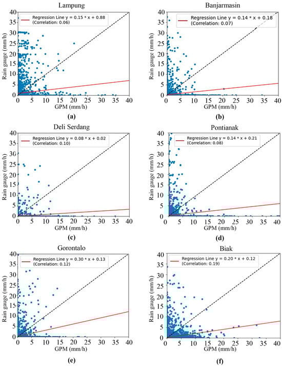Scatter plots and correlation of GPM and rain gauge data in (a) Lampung, (b) Banjarmasin, (c) Deli Serdang, (d) Pontianak, (e) Gorontalo, and (f) Biak.