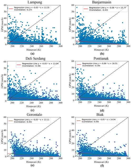 Scatter plots and correlations between GPM and Himawari satellite data in (a) Lampung, (b) Banjarmasin, (c) Deli Serdang, (d) Pontianak, (e) Gorontalo, and (f) Biak.