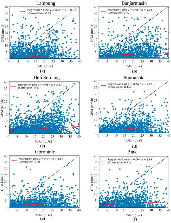 Scatter plots and correlations between GPM and weather radar data in (a) Lampung, (b) Banjarmasin, (c) Deli Serdang, (d) Pontianak, (e) Gorontalo, and (f) Biak.