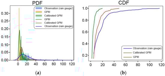 Compared with the original product, the bias-corrected GPM product showed a better performance in estimating rainfall values. We display a graph of the probability density function (PDF), which is used to describe the probability distribution of a continuous random variable at a certain point. Additionally, a cumulative distribution function (CDF) graph is presented to illustrate the cumulative PDF of a random variable. This graph shows how often a random variable takes either a certain value or less than a certain value in its distribution; as a result, the graph can help in understanding the distribution, evaluating the probabilities, and identifying the patterns in GPM data before and after bias correction.