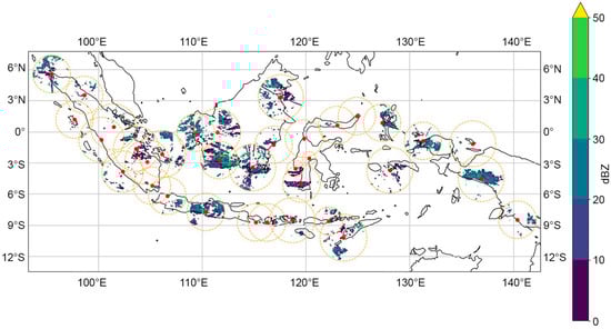 A national weather radar network was generated in this study with a total of 35 weather radars being integrated. This merging employed the spatial averaging of composite data, accommodating differences in frequency bands, such as C and X; differences in polarization, including single and dual; and differences in range, as illustrated in Figure 7.