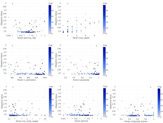 Each hyperparameter was optimized to achieve a low objective value, which indicated a better model performance, as seen in Figure 8. The objective function in XGBoost regression is an evaluation metric, such as the mean squared error (MSE). In the learning_rate graph, it can be seen that the optimal value was in the range of around 0.01 to 0.1. A learning rate that is too high (>0.1) tends to produce a higher objective value, indicating overfitting. Meanwhile, a learning rate that is too low (<0.01) also does not provide the best performance because the model may be too slow to converge. For the hyperparameter max_depth, the optimal value was one. A too-deep depth (>6) is not optimal because it makes the model too complex. The graph for n_estimators shows that underestimating the number of estimators gave the best objective value. There is an ideal number of decision trees that should be used to achieve a balance between bias and variance. In the subsample graph, the optimal value was 0.96. For min_child_weight, the optimal value was 0.14. Higher values (>5) did not provide the best performance, indicating that the model requires some complexity to capture variations in the data. The gamma graph shows that the optimal value was 0.08, which shows that proper regularization is necessary to avoid overfitting. Finally, for colsample_bytree, the optimal value was around 0.4. Low or high values did not perform best, indicating that proper column sampling is necessary to reduce the correlation between trees.