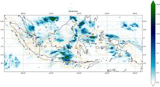 Rainfall measurements in Indonesia are generally performed using two methods: direct observation via a rain gauge and indirect estimation via remote sensing [,,]. The measurements using rain gauges are accurate; however, the total surface area of rain gauges in Indonesia covers only 1.29 × 10−11 of the country’s total area. This inadequate gauge density results in inaccuracies when representing the total rainfall across an area []. The distribution of rain gauges in Indonesia also highlights a concerning disparity in gauge density. Papua Island, the eastern region of Indonesia, has fewer rain gauges even though the region has local rain patterns with its diverse topography. In contrast, Java Island, the southern region of Indonesia, has a monsoon pattern and non-complex topography, but the rain gauge distribution there is very dense. The optimum rain gauge network has been the subject of research and operation in Indonesia over the years [,]. However, the national weather radar network does not cover the entire observation area in Indonesia []. Several weather radars also cannot explain a single relationship between radar reflectivity and rainfall []. The variability in this relationship can certainly affect the accuracy of rainfall estimates using weather radars. Meanwhile, weather satellite images with global coverage have resolution limitations []. In measuring rainfall in Indonesia, the necessity for a wide spatial coverage with a high level of resolution is the main challenge [,]. This condition explains why the existence of only one data source is insufficient to fulfill Indonesia’s need for reliable rainfall data.
