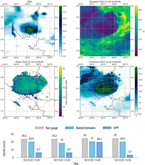 The rainfall estimates for light-rain events also showed better results when compared with the GPM rain estimates. As Figure 13 shows, the rainfall estimates based on the input Himawari data with a brightness temperature of 260 °K and radar data with a reflectivity of 15 dBZ produced a rainfall estimate of 3.9 mm/h, close to the rain gauge measurement of 4.2 mm/h. Physically, rain can, indeed, occur when the cloud top temperature approaches 260 °K []. However, at this temperature, the number of droplets is not very significant, as measured by the radars. Therefore, light rain occurred in a relatively short time. These estimation results reflect the model’s ability to utilize input data from radars and Himawari satellites to produce rainfall estimates that are close to observed values, including during light-rain events.