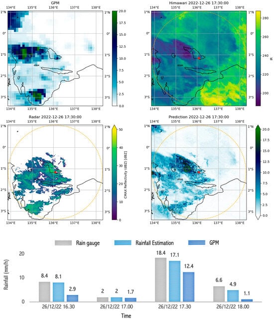 Image capture of GPM, radar, satellite, and estimation model results as well as comparison graphs of rain between rain gauge, GPM, and rainfall estimation during ongoing rain which occurred during heavy rain (10–20 mm/h) in Biak on 26 December 2022 between 16.30 and 18.00.