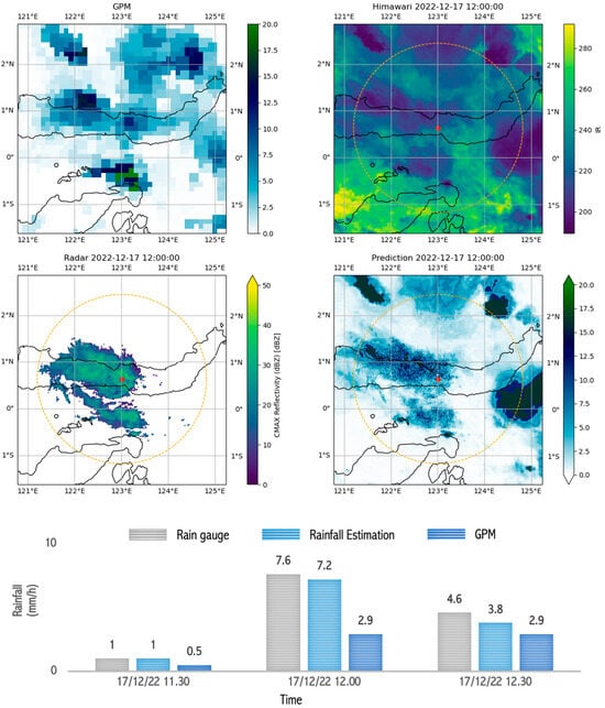 Image capture of GPM, radar, satellite, and estimation model results as well as comparison graphs of rain between rain gauge, GPM, and rainfall estimation during ongoing rain that occurred during moderate rain (10–20 mm/h) in Gorontalo on 17 December 2022 between 11.30 and 12.30.
