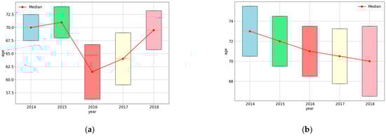However, although hospitals worldwide have established sophisticated hospital in-formation systems, there are still differences in the storage methods and the data quality of EHRs between different hospitals []. At the same time, there are also challenges such as data ownership and privacy protection []. Therefore, it is difficult to integrate long-term data from multiple hospitals at once, to build a large-scale and high-quality multivisit EHRs dataset. In practical settings, chronic disease risk prediction modeling based on EHRs is often conducted in a few-shot and nonstationary environment. Few-shot EHR data are gradually generated and collected in batches. There are also significant differences in the distribution of data attributes for each batch. Figure 1 shows the statistics of EHR data of hypertensive patients from two hospitals in Hainan Province, China, demonstrating the distribution of the age of patients examined in each of the 5 years. It can be seen that the age characteristics of patients continuously change over five years. In subplot a of Figure 1, the age of patients ranged from 67.5 to 72.5 in 2014, increased in 2015, and then dropped significantly to 56–67 in 2016, before gradually rising again to 66–73. In subplot b of Figure 1, the age of patients consistently decreased from 70.6–75.8 to 66.5–73. In both datasets, the age distribution of patients is different in each year, and such changes lead to a fixed hypertension prediction model being unable to meet the actual needs of the patients.