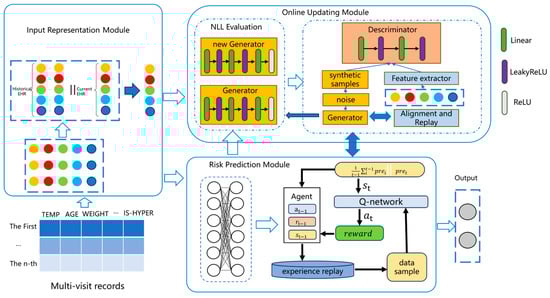 Such a few-shot and nonstationary environment leads to adversarial differences between the feature space of disease prediction models and the continuously inputted incremental EHR data, which brings about the need for online learning of the model. However, the factors affecting hypertension risk are often multifaceted, requiring high-dimensional data for prediction []. Existing online learning methods struggle with learning high-dimensional data features. For examples, Ning et al. [] proposed a robust algorithm using polar decomposition for derivation, transforming the learning problems into optimal feedback control problems for a group of low-dimensional linear systems and using optimal control to achieve learning from high-dimensional online data. However, such complex deep learning models tend to overfit to noisy data when the data are small []. When data distribution changes significantly, excessive adaptation to new data will also lead to a decrease in the generalization ability of the model.