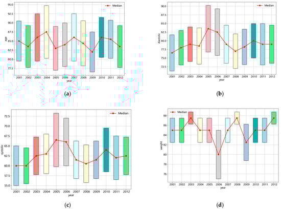 Distribution of characteristics over 12 years. (a) Distribution of age over 12 years; (b) distribution of diastolic blood pressure over 12 years; (c) distribution of systolic blood pressure over 12 years; (d) distribution of weight over 12 years.