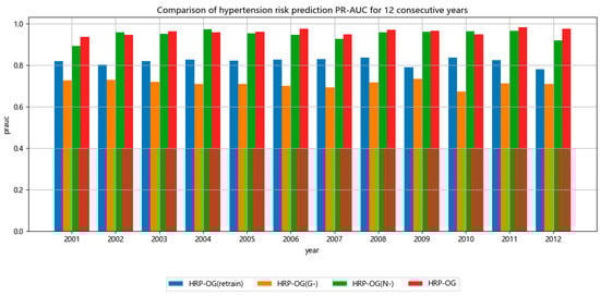In the experiments, the multivisit records are divided into 12 batches by year to simulate the scenario of incremental data in a nonstationary environment. Each batch of data is randomly split into training set, test set, and validation set in a ratio of 3:1:1. The results of 5-fold cross-validation are shown in Table 4 and Table 5, which present the accuracy and PR-AUC values of different models, respectively. We recorded the performance changes of the models over 12 stages and calculated the average performance over these 12 stages. Despite fluctuations in the data, all models showed performance variations within a certain range, indicating differences in their ability to learn hypertension features.