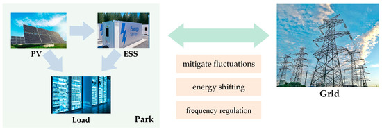 In the “self-generation and balance grid” mode, PV storage parks reduce the deviation between the actual and predicted photovoltaic output through ESSs. This mode enhances photovoltaic consumption rates and economic benefits by leveraging the energy time-shifting capabilities of storage or through electricity transactions with the main grid [17]. The ESS plays a crucial role in smoothing fluctuations, shifting energy over time, and participating in frequency regulation, as shown in Figure 1. This study investigates the coordinated optimization strategy for multi-scenario applications of ESSs, ensuring the safe and reliable operation of photovoltaic storage parks. It also aims to enhance economic benefits and increase the photovoltaic energy consumption rate.