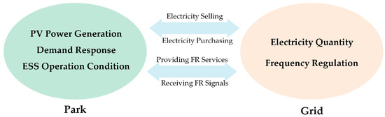 The park’s grid-interactive energy market comprises two main activities: selling electricity from the park to the grid and purchasing electricity. Specifically, electricity is purchased from the grid when the photovoltaic output falls short of meeting the load demand, and surplus electricity is sold to the grid when the photovoltaic output exceeds the park’s internal load and energy storage capacity [25]. This is illustrated below: