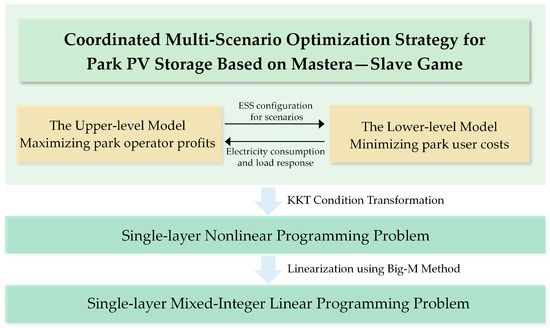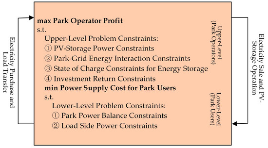 The significance of dual-level planning lies in considering the interests of both upper-level operators and lower-level users. Therefore, a dual-level optimization model for the joint operation of a PV storage system in the park is established, as shown in Figure 3. To solve this max-min model, KKT conditions are used to transform the lower-level model into constraints of the upper-level model, and the solution provides optimized operation schemes for the park under different operation modes [27].