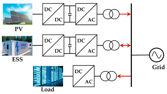 Further investigation into the operational control of integrated ESSs across various application scenarios is essential. In response to the increasing peak–valley differences in commercial parks, Ref. [4] proposes a variable-parameter power difference control strategy for peak shaving and valley filling, establishing control strategies for ESSs based on different load intervals and state-of-charge (SOC) intervals. Ref. [5] presents a demand-side response model that combines combinatorial programming with particle swarm optimization, aiming to evaluate its impact on the economic benefits and ESS configuration of microgrids. Ref. [6] develops an equivalent value evaluation model for ESS applications, focusing on peak shaving, valley filling, and the smoothing of new energy fluctuations. This includes two equivalent evaluation models based on power difference and prediction accuracy. Refs. [7,8] suggests a revenue optimization method for ESSs participating in energy management within PV storage systems. Refs. [9,10] employ wavelet analysis to suppress photovoltaic power fluctuations and enhance photovoltaic output stability. In summary, ESSs offer diverse application modes that significantly improve the grid’s capacity to absorb new energy across multiple scenarios. Nevertheless, further research is needed on the coordinated optimization and energy distribution of PV storage systems across various application scenarios.