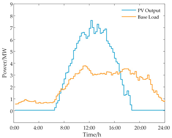 The settings for the PV output limit and the basic load curve are illustrated in Figure 6. The load transfer fluctuation does not exceed 1 MW, and the degree of variation does not exceed 40%. During periods when light is limited, the power grid does not encourage photovoltaic grid connection, resulting in lower electricity prices. During non-light-limited periods, the power grid purchases PV energy at standard electricity prices. The electricity sale prices of the power grid are divided into three categories based on time nodes: peak, valley, and flat [31,32]. The settlement period for energy interaction and load compensation is 15 min. This approach dynamically adjusts and optimizes the energy flow and load distribution within the park, ensuring efficient operation and maximizing economic benefits.