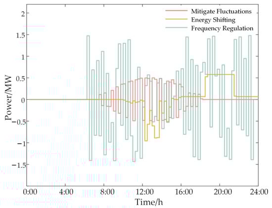 Figure 9 illustrates the operational performance of the ESS in three functions: PV fluctuation smoothing, energy time shifting, and frequency modulation markets. During noon periods, significant PV output fluctuations require the ESS to stabilize these variations to maintain system stability. Simultaneously, the system prioritizes energy time shifting over frequency modulation, as the economic benefits of time shifting exceed those of participating in frequency modulation, thereby optimizing ESS utilization.