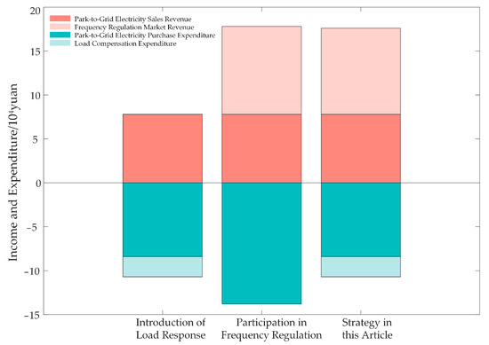 To verify the effectiveness of the proposed operation strategy, three comparative scenarios are analyzed: the introduction of a load response mechanism within the park, the participation of PV storage in the frequency regulation market, and the various application scenarios discussed in this article. The optimization results are presented in Table 2 and Figure 7. As shown in Table 2, implementing energy time shifting within the park significantly reduces both electricity expenditures and photovoltaic power curtailment. Additionally, participating in the frequency regulation market markedly enhances the economic benefits for park operators.