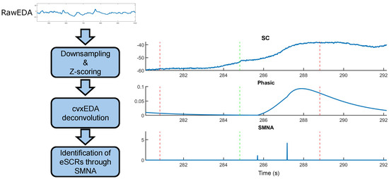 SC can be modeled as the superimposition of two components: a slow-varying tonic component and a fast-varying phasic component [28]. The latter is of particular interest for this study, as it contains information about SCRs.
