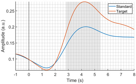 The average SCR responses to the standard (blue) and target (red) stimuli in the −1–8 s interval with respect to the stimulus onset (black vertical line). The gray shaded area indicates a significant difference (p < 0.05) between SCRs, with a higher response to targets in the 2.8, 5.4 s interval with respect to the response to standards.