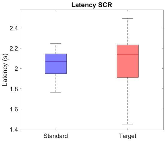 In Figure 3, we report the results of the statistical analysis on the latency of SCRs to standard and target stimuli, evaluated as the first nonzero burst of SMNA activity in the 1–5 s time window after stimulus onset. We did not find any significant difference in the latency of the responses.