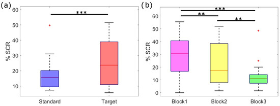 Statistical analysis of the percentage of stimulus-evoked SCRs (**: p < 0.01, ***: p < 0.001). Red plus signs indicate outliers in the distribution. (a) Percentage of SCRs to standard (blue) and target (red) stimuli, irrespective of the stimulation block. Target stimuli elicited more SCRs compared to standard stimuli (SCRtarget = 32%, SCRstandard = 16%, p < 0.001); (b) percentage of SCRs evoked by any stimulus type across blocks. There is a significant decrease in the percentage of SCRs over time.