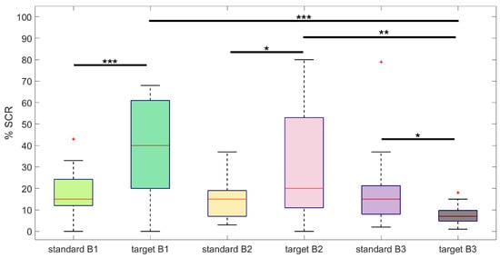 Post hoc analysis of the interaction between stimulus type (standard, target) and stimulation block (B1, B2, B3) on the percentage of evoked SCRs (*: p < 0.05, **: p < 0.01, ***: p < 0.001). Red plus signs indicate outliers in the distribution. There is a significant habituation to the target stimuli, as the percentage of SCRs evoked by targets decreases over blocks. On the other hand, the percentage of SCRs evoked by standard stimuli does not differ across stimulation blocks. Interestingly, the number of responses in the third stimulation block is higher for standard stimuli, compared to targets.