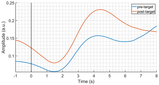 Grand–average SCR responses to the standard stimuli presented immediately before (pre–target, blue) and after (post–target, red) target stimuli in the −1–8 s interval with respect to the stimulus onset (black vertical line). No significant difference has been found between responses.