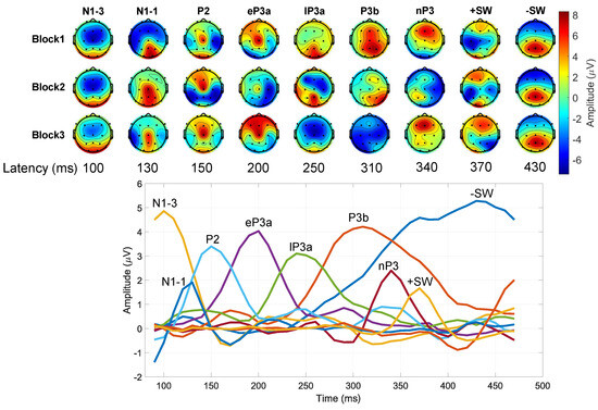 Figure 8 shows the results of temporal PCA decomposition on the subject-average responses to target stimuli. The first nine factors accounted for about 94.8% of the total variance, with a maximum of 38.7% for the first factor, and a minimum of 1.15% for the ninth factor. We did not consider any further factors since they explained a variance lower than 1%. We associated each of the selected factors to established components in the time range from the N1 to the SW, based on their peak latency, polarity, and scalp topography. We found two subcomponents of the N1, i.e., N1-3 and the N1-1, at a latency of 100 ms and 130 ms, respectively, [10,39], followed by a P2 component peaking at 150 ms and centered at the vertex Cz. Concerning the LPC, we found both a eP3a and a lP3a, peaking at 200 ms and 250 ms, respectively, [40]. The eP3a was distributed towards central and frontal regions around Cz and Fz, whereas lP3a was shifted towards central and parietal regions around Cz and Pz. Furthermore, we observed a P3b component with latency of 310 ms and a topography focused around Pz, followed by a frontal nP3 peaking at 340 ms around Fz [39,40]. Finally, we found two subcomponents of the SW, namely the positive SW (+SW) at 370 ms and the negative SW (−SW) at 430 ms [39,41]. Both +SW and −SW topographies showed a maximum and a minimum, respectively, in the frontal region around Fz.