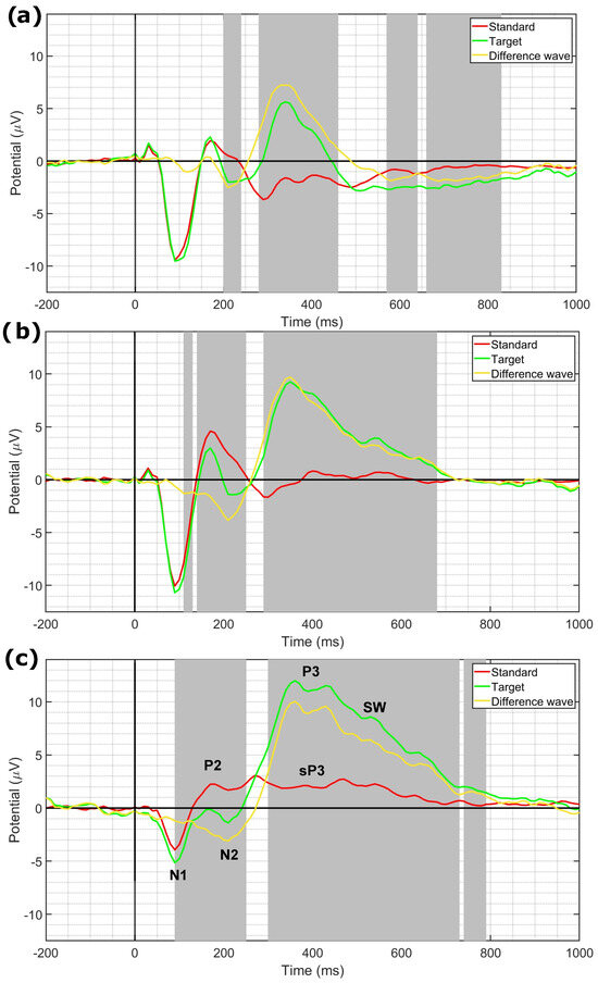 Grand-average ERP responses to the standard (red) and target (green) stimuli, and the difference between them (difference wave; yellow), evaluated at (a) Fz, (b) Cz, and (c) Pz channels. Responses are plotted in the (−200–1000) ms interval with respect to the stimulus onset (black vertical line). The gray shaded areas indicate significant differences between responses to standard and target stimuli (p < 0.05).