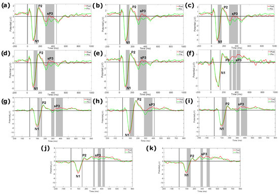 Results of the statistical comparison between ERP responses to standard stimuli observed immediately before (pre–target) and after (post–target) target stimuli. We report only those channels that showed a significant difference between responses, including (a) Fp1, (b) Fz, (c) Fp2, (d) F3, (e) F4, (f) T3, (g) C3, (h) Cz, (i) C4, (j) P3, and (k) P4. For each of them, we show the grand-average ERPs associated with the pre–target and post–target conditions, respectively, in the −200, 1000 ms time range. Gray shaded areas indicate a significant difference between ERP amplitudes (p < 0.05). Post-target responses showed a more negative N1 amplitude and a more positive standard P3 (sP3) amplitude, with respect to pre-target responses.