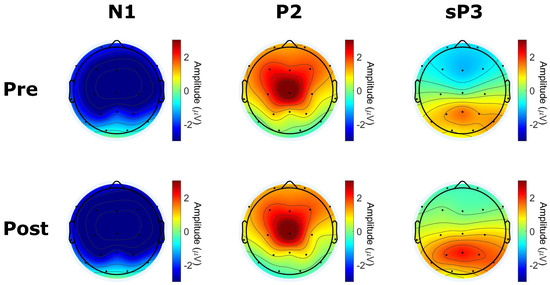 Grand-average scalp map distribution of individual ERP components’ amplitude (N1, P2, standard P3 (sP3)) associated with the standard stimuli presented before (pre) and after (post) target stimuli. Amplitude was calculated as the average within the a priori defined time range for each component. Post responses showed a significantly more negative N1 amplitude and a more positive sP3 amplitude, with respect to pre–responses.