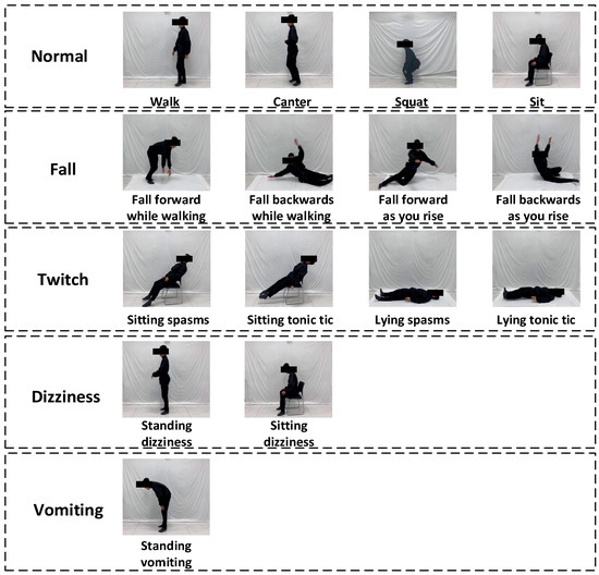 This study collected data on four types of fall behaviors. These included a simulation of an elderly individual suddenly falling while walking and the potential for secondary falls occurring during the process of getting back up. This categorization addresses the diversity and complexity of fall incidents, allowing for a more accurate identification and analysis of falls and their consequences. Additionally, this study examined four types of seizure actions in elderly individuals, simulating tonic seizures and cramp-like spasms in both sitting and lying positions. This classification aids in distinguishing different seizure types, which may bear distinct medical significance and management approaches in clinical practice. Furthermore, this research involved the collection of two types of dizziness actions. These events simulated instances where an elderly person experiences dizziness suddenly while walking or resting in a seated position. Given that dizziness is a common health concern among older adults, timely identification and intervention are crucial. Lastly, this study also included the collection of a vomiting action, simulating an elderly individual suddenly vomiting while bending over in a standing position. This scenario may reflect health challenges faced by seniors in specific environments, such as reactions due to fainting or dizziness.