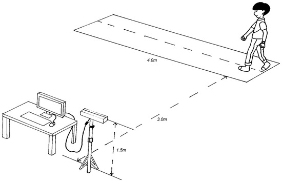 This experiment utilized a Kinect 2.0 camera, boasting a pixel resolution of 1080P and stable performance, to capture video from a lateral perspective of various behavioral actions. The camera was mounted on a fixed tripod, set at a height of 1.5 m, with subjects positioned three meters away. Actions were simulated within a span of four meters, as illustrated in Figure 2. Given the unique challenges of detecting abnormal behaviors, collecting authentic data on elderly individuals proved difficult. Therefore, this study employed young participants dressed in elder-life simulation suits to mimic abnormal actions representative of the elderly. This experiment took place in a high-visibility environment, free of obstacles that might obscure the subjects, ensuring optimal operational conditions for the model and minimizing external noise interference on the results. A total of 25 individuals participated in this simulation, including 17 males and 8 females, with an average age ranging from 22 to 27 years. Soft mats surrounded the active area to prevent any injuries among participants, all of whom provided informed consent before participating in the experiment.