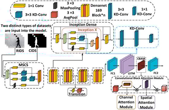 This article improves the model by using a DenseNet–LSTM network as the model’s basic architecture foundation, in which DenseNet can effectively extract spatial information from images and LSTM can capture temporal dependencies in sequential data. By observing the activation of the convolutional layers in DenseNet and the gate units in LSTM, a better understanding of the decision-making process of the model in anomaly behavior recognition can be achieved, showing good interpretability [27]. However, using DenseNet–LSTM as the basic framework for anomaly behavior recognition also has its flaws. Therefore, this article makes the following improvements to the model: