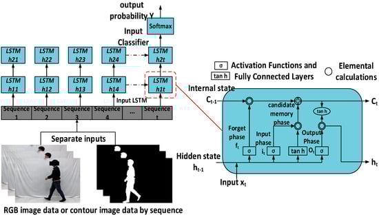 Long Short-Term Memory Networks (LSTMs) are a special type of RNN that are particularly suitable for processing sequential data [34]. This paper constructs a two-layer LSTM network structure for the deep exploration of human behavioral temporal features, as shown in Figure 7. LSTM mainly consists of a forget phase, input phase, and output phase, and the internal operations are mainly divided into three stages: forget, memorize, and output. The formulas for each process are as follows: