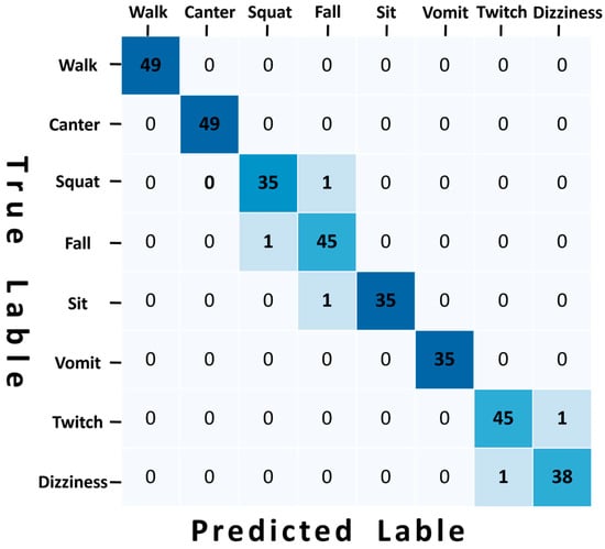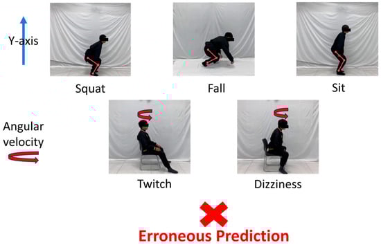 The confusion matrix indicates that a set of falling and squat actions were mistakenly identified as squats and falls, while a set of sitting actions were misclassified as falls. Additionally, movements characterized by twitching and dizziness were wrongly interpreted as dizziness and twitching. As illustrated in Figure 10, this misclassification may stem from the spatial displacement of limbs during squatting, sitting, and falling actions, all of which involve certain degrees of leg flexion, leading to model errors. Furthermore, the action amplitudes of twitching and dizziness fall within similar ranges, and the torso exhibits notable shaking, contributing to misidentification by the model. A comprehensive analysis of the confusion matrix and error prediction graphs reveals that extreme misclassifications predominantly occur between similar actions that may overlap in movement trends. Nonetheless, even under these circumstances, the occurrence rate of misclassification remains very low. In everyday life, only a few anomalous activities share identical motion trends, thereby demonstrating the practical applicability of the proposed MSCS–DenseNet–LSTM model in real-world scenarios.