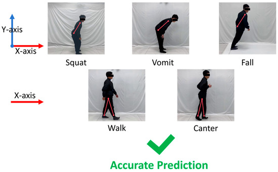 The confusion matrix indicates that the MSCS–DenseNet–LSTM model accurately predicts three behaviors with similar motion trends: squatting, vomiting, and falling. It also perfectly forecasts slow walking and jogging. Figure 11 reveals that squatting, vomiting, and falling exhibit some degree of similar curvature in the trunk region. In contrast, slow walking and jogging display comparable crossing angles in leg movements. Analyzing the confusion matrix alongside the correct prediction comparison confirms that this model precisely identifies actions with similarities and overlaps. Thus, this study demonstrates the practicality of the proposed MSCS–DenseNet–LSTM model in real-life scenarios.