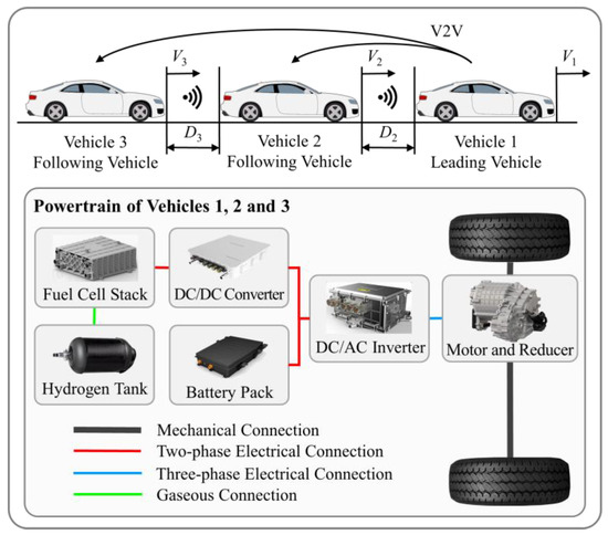 Consider a homogeneous vehicle platoon consisting of three fuel cell electric vehicles (FCEVs) as shown in Figure 1, where the leading vehicle is labeled 1 and the following vehicles are named 2 to 3. Moreover, due to the superior performance of anti-interference, the vehicle platoon adopts the predecessor–leader–following (PLF) communication topology [50]. The displacement, velocity, and acceleration information of neighboring or leading vehicle is obtained by using on-board sensors, radars and vehicle-to-vehicle (V2V), to plan movement of following vehicles at the next moment. To ensure the effectiveness and consistency of economic performance verification, the velocity of leading vehicle is determined by a standard driving cycle. Moreover, in each individual, the studied FCEV consists of a fuel cell system, a battery pack, a motor and its reducer, a unidirectional DC/DC converter, and a bidirectional DC/AC converter. The fuel cell system and battery pack provide energy to the motor through DC/AC converter, thereby driving the vehicle. The detailed parameters are shown in Table 1.
