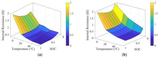 where is the battery terminal voltage, is the battery open circuit voltage, and is the battery current. is the battery internal resistance, which is a function of battery temperature and battery SOC, as shown in Figure 3. is the battery SOC, and is the battery capacity.