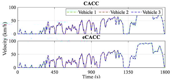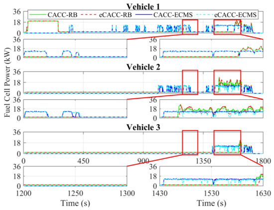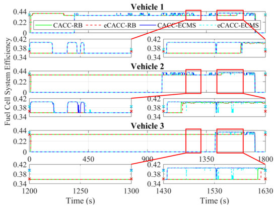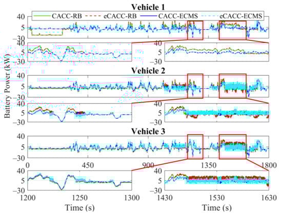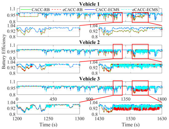 Figure 19 and Figure 20 record the cell power and its efficiency. Since the battery is used to respond to the power gap between the powertrain and the fuel cell, the battery power exhibits a large fluctuation in vehicles 2 and 3, especially in the simulation range between 1430 s and 1630 s. Nevertheless, as can be seen in Figure 20, the battery carried by each vehicle applying eCACC-ECMS exhibits a slight average efficiency advantage of around 1% to 3%. This provides a positive contribution to the realization of the energy-saving advantages of the fuel cell under eHCACC, leading to optimized overall energy consumption and thus fully exploiting the energy-saving potential of the FCEV platoon.